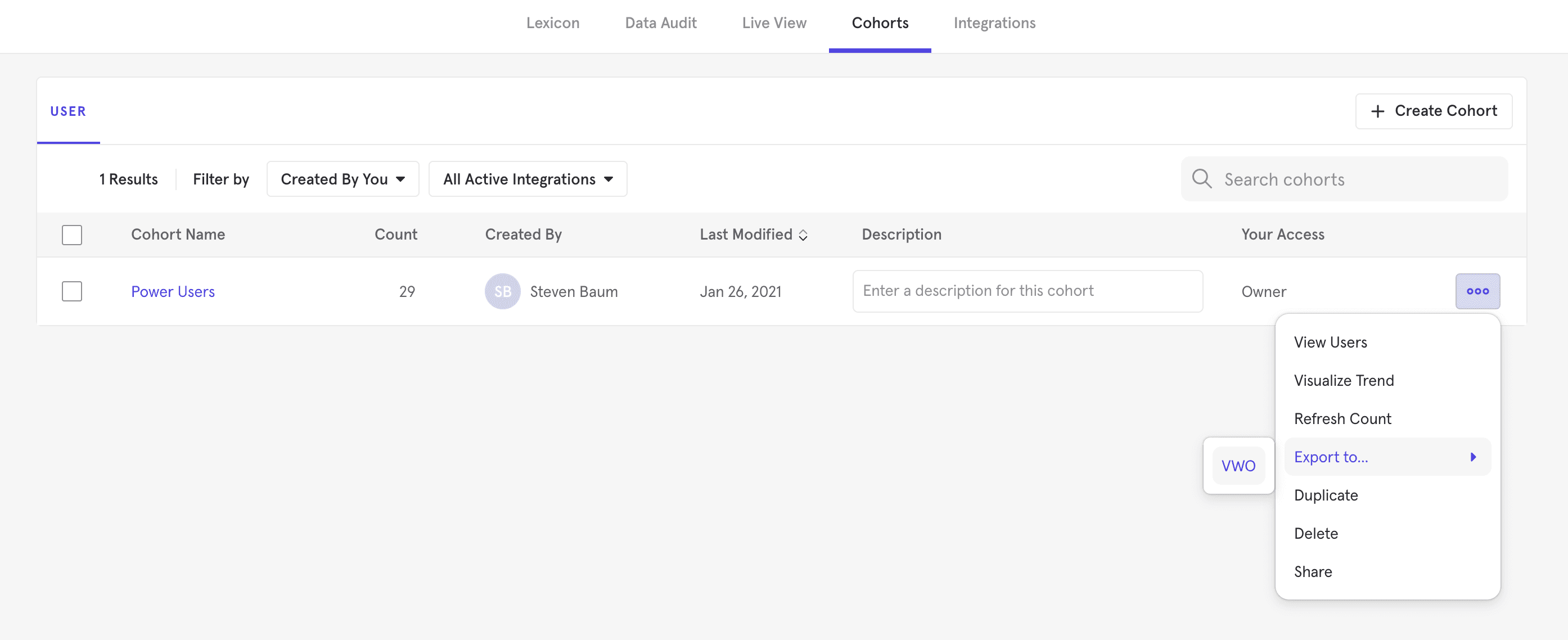 Export Mixpanel cohorts to VWO to create custom segments that you can apply in your VWO experiments. Manage the VWO integration from the Mixpanel integrations page.
